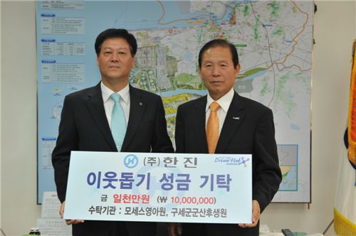 이날 한진이 기부한 성금 1000만원은 군산시가 관할지역 내에 신규로 영업점을 설립하는 기업들에게 지급하는 '지점 설립 지원금'으로서, 한진이 올 1월 개시한 군산~광양간 연안운송사업과 관련하여 물류지점을 설립하며 군산시로부터 지급 받은 '지원금'을 기탁하는 것이다.