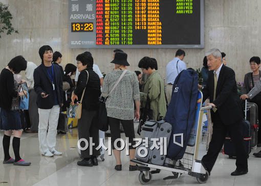 일본의 황금연휴 기간을 맞은 25일 서울 김포공항에 국제선 입국장에 한국을 찾은 일본인 관광객들로 북적 이고 있다.