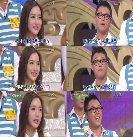 송호범의 아내 백승혜도 남편 못잖은 입담을 과시했다. "백승혜씨 본인도 산다라박을 닮았다고 생각하나?"라는 질문에 백승혜는 "2NE1의 산다라박을 닮았다고 말해준 건 남편이다. 이 때문에 간혹 '누가 너를 닮았다고 하는 거냐' 등의 많은 악플이 달려 상처를 받았다"고 털어놓았다.