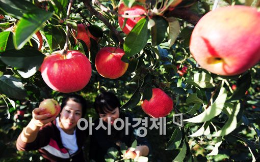 26일 오후 수원시 권선구의 한 과수 농가에 주민들이 탐스럽게 익은 사과를 보며 가을을 즐기고 있다.