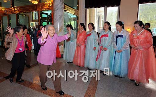 27일 오후 남측 이산가족들이 금강산호텔에서 열린 공동 중식에 참가하기위해 호텔에 들어서고 있다.