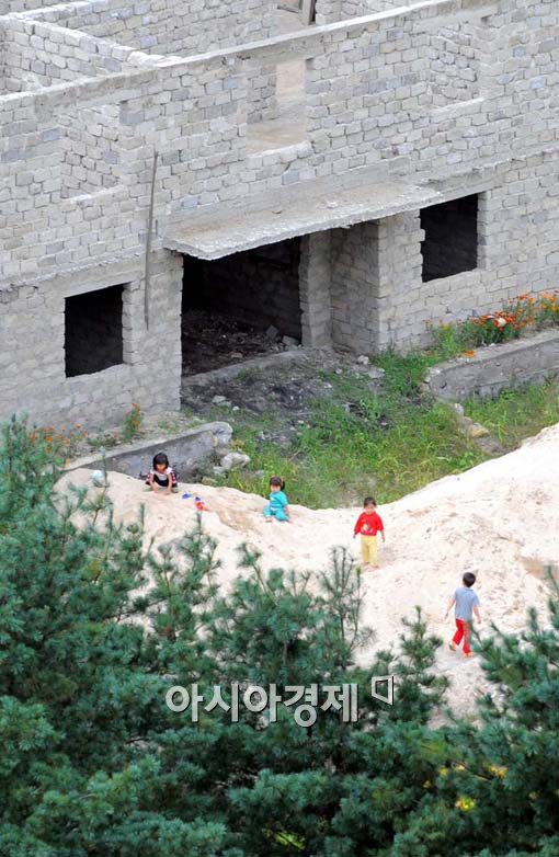 27일 오후 금강산호텔 인근 마을에서 휴일을 맞은 북측 어린이들이 모래놀이를 하고 있다.