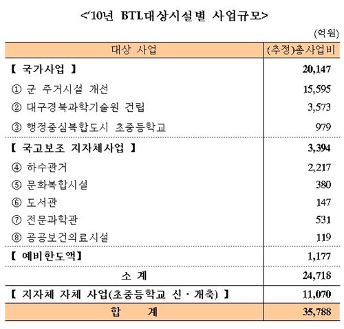 정부는 학교, 군(軍) 주거 시설, 하수관거 등 국민생활에 필수적인 사회기반시설 가운데 조기확충이 시급한 사업 위주로 내년 BTL 사업을 추진한다는 방침.