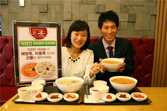 본죽 관계자는 "최근 직장인들의 간편한 점심메뉴로 '죽'이 인기를 얻고 있다"며 "낙지김치죽은 남성의 숙취해소 및 스테미너에 좋고 버섯굴죽은 여성의 노화방지와 피부미용에 효과가 있다"고 말했다.