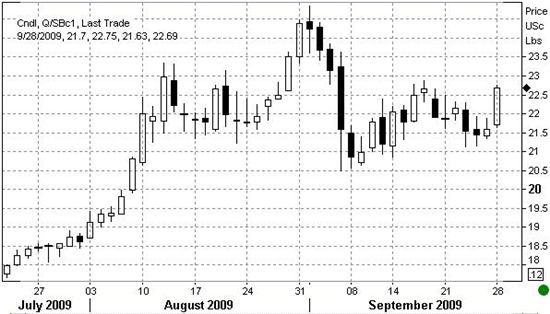 30일이 10월물 만기일이기 때문에 가격 반등폭이 확대된 면이 없지 않기 때문에, 일단 최근월물의 전고점이자 28년반 최고가인 24.95센트 탈환을 목표로 매수에 가담하겠지만 이미 많이 오른 상황에서 추가 배팅의 무리수를 둘 필요는 없다는 지적이다.