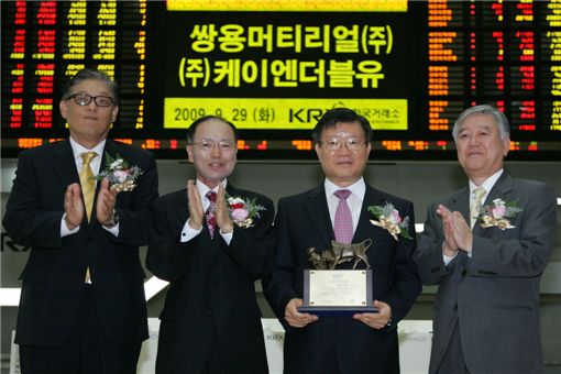 [아시아경제 임선태 기자]$pos="C";$title="상장기념패 전달 후 기념촬영 ";$txt="(사진)왼쪽부터 정태영 대우증권 본부장, 이광수 한국거래소 유가증권시장본부장, 이영조 쌍용머티리얼 대표, 정영태 한국상장회사협의회 전무
