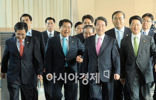 [아시아경제 이재문 기자] 정운찬 신임 국무총리가 29일 오전 세종로 정부종합청사 별관 취임식장으로 국무위원, 국무총리실 관계자들과 이동하고 있다
