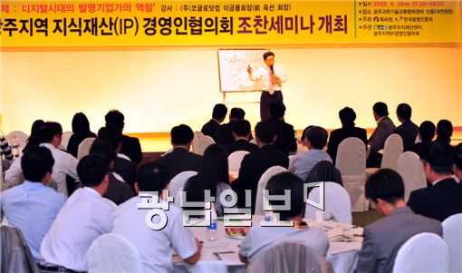 이날 행사에는 이금룡 한국원천기술협회장이 '디지털 시대의 발명기업가의 역할'이라는 주제로 1시간 30분동안 강연했고 광주지역 지식재산 경영인협의회와 중소기업 CEO 등 100여명이 참여해 지식재산에 대한 높은 관심을 보였다.