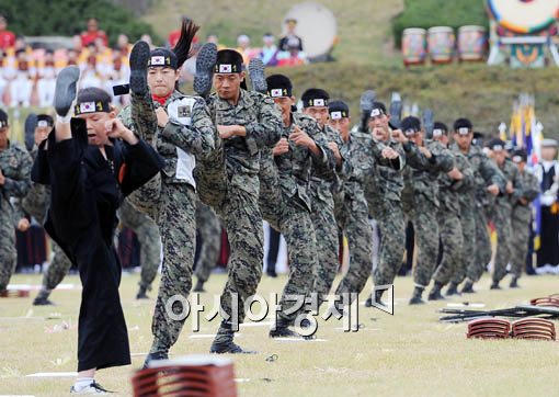 건군 제61주년 국군의 날을 앞두고 29일 오전 충남 계룡시 계룡대 연병장에서 열린 국군의 날 기념식 예행 연습에 특전사 장병들이 특공 무술 시범을 보이고 있다.