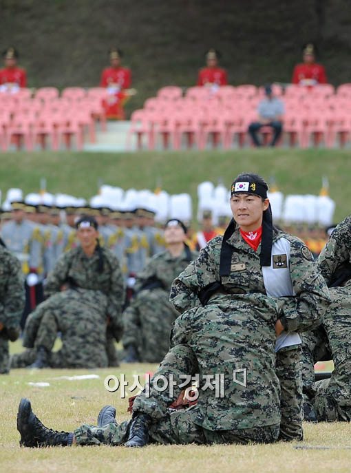 건군 제61주년 국군의 날을 앞두고 29일 오전 충남 계룡시 계룡대 연병장에서 열린 국군의 날 기념식 예행 연습에 특전사 장병들이 특공 무술 시범을 보이고 있다.