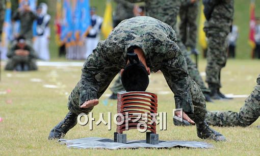 건군 제61주년 국군의 날을 앞두고 29일 오전 충남 계룡시 계룡대 연병장에서 열린 국군의 날 기념식 예행 연습에 특전사 장병이 격파 시범을 보이고 있다.