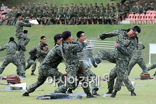 건군 제61주년 국군의 날을 앞두고 29일 오전 충남 계룡시 계룡대 연병장에서 열린 국군의 날 기념식 예행 연습에 특전사 장병들이 격파 시범을 보이고 있다.