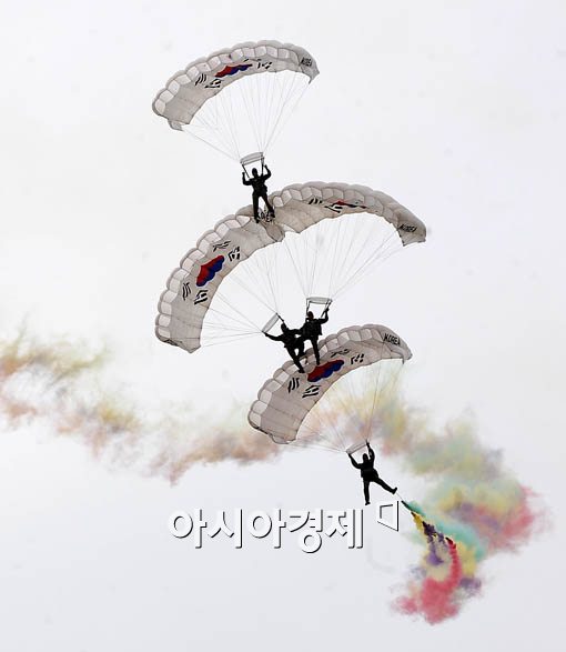 건군 제61주년 국군의 날을 앞두고 29일 오전 충남 계룡시 계룡대 연병장에서 열린 국군의 날 기념식에 특전사 고공 강하 시범자들이 다이아몬드 형태를 완성해 활공하고 있다.