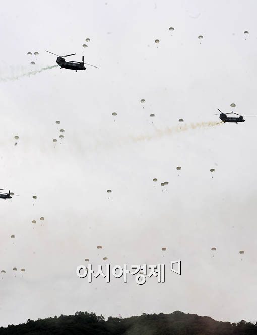 [아시아경제 윤동주 기자] 건군 제61주년 국군의 날을 앞두고 29일 오전 충남 계룡시 계룡대 연병장에서 열린 국군의 날 기념식에 특전사 고공 강하 시범자들이 해상작전헬기인 링스헬기 편대와 어울리며 고공낙하 시범을 보이고 있다.