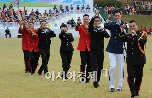 [아시아경제 윤동주 기자] 건군 제61주년 국군의 날을 앞두고 29일 오전 충남 계룡시 계룡대 연병장에서 열린 국군의 날 기념식에 조인성 공군 이병, 이정희 해병대 상병등 연예인 출신 병사들이 공연을 하고 있다.