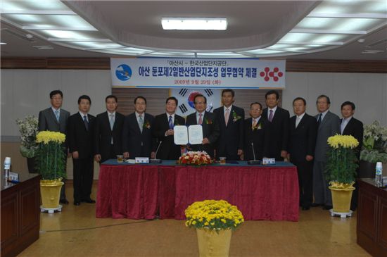 아산시와 한국산업단지공단은 이를 위해 29일 오전 시청 상황실에서 강희복 아산시장, 박봉규 한국산업단지공단 이사장, 김준배 아산시의회 의장, 지역 시의원 등이 참석한 가운데 아산 둔포 제2일반산업단지조성을 위한 업무협약을 맺었다.
