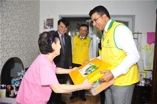 [아시아경제 김혜원 기자] 아흐메드 에이 수베이 에쓰오일 CEO가 강서구 등촌동 일대의 저소득 가정에 방문해 직접 빚은 송편과 생필품 꾸러미를 전달하고 있다.