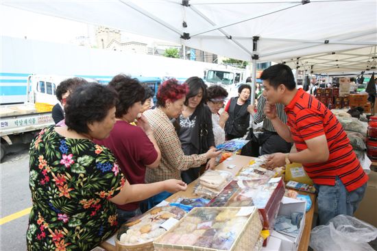 30일 오후 6시까지 계속되는 이번 장터에는 이천 제천 삼척 예산 영월 담양 고창 등 성북구와 자매결연 관계에 있는 국내 7개 자치단체가 모두 참가했으며 품질과 가격 면에서 구매자들로부터 모두 좋은 반응을 얻고 있다.