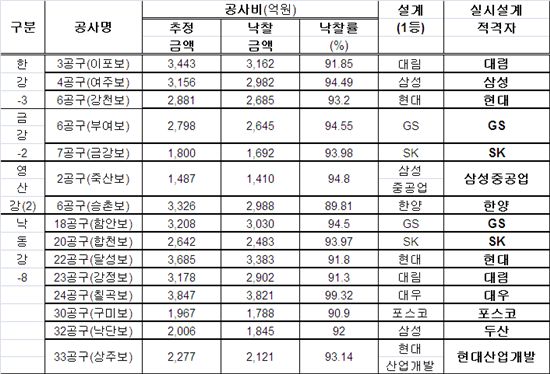 대림산업은 한강3공구(이포보) 3162억원(91.85%), 낙동강23공구(강정보) 2902억원(91.3%)을 써내 실시설계 적격자에 선정됐다.