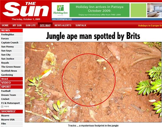 타블로이드 신문 ‘더 선’은 탐험대가 수마트라 섬 정글에 사는 것으로 알려진 전설 속의 원숭이인간을 목격하고 발자국을 촬영했다고 지난달 30일(현지시간) 보도했다.