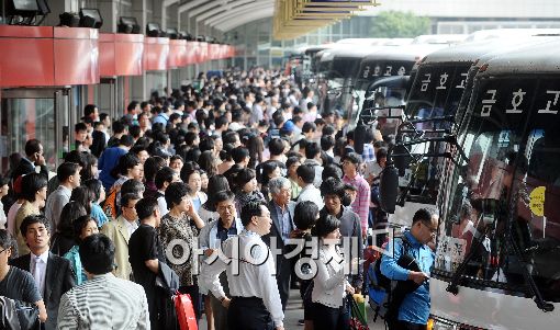 [아시아경제 이재문 기자] 추석연휴를 앞두고 1일 오전 서울 강남고속버스터미널 승차장은 고향에 가려는 귀성 인파가 몰려들면서 북적거리고 있다.