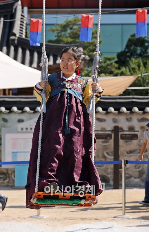 [아시아경제 윤동주 기자] 고향의 정이 풍성한 한가위를 맞이한 3일 서울 남산 한옥마을에 한복을 곱게 차려입은 한 어린아이가 그네를 타며 즐거운 시간을 보내고 있다.