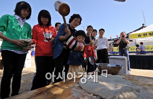 [아시아경제 윤동주 기자] 고향의 정이 풍성한 한가위를 맞이한 3일 서울 남산 한옥마을에 한복을 곱게 차려입은 한 어린아이가 할머니와 함께 떡매를 치며 즐거운 시간을 보내고 있다.