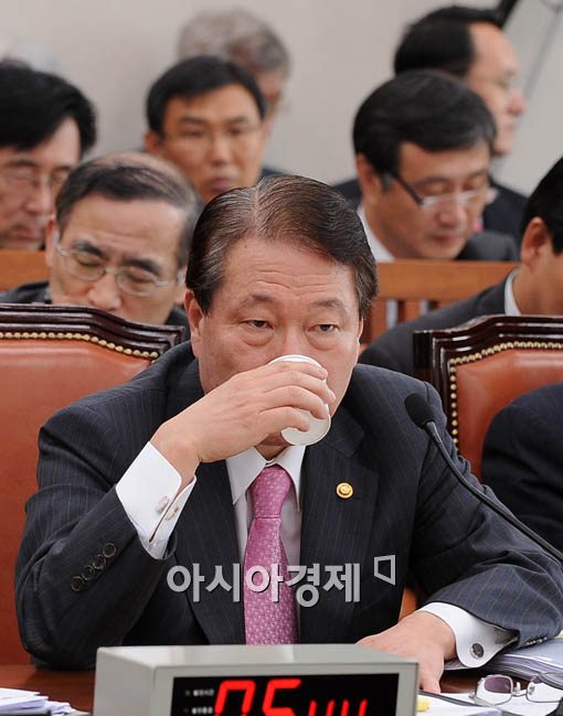 [아시아경제 윤동주 기자] 5일 오후 국회에서 열린 외교통상부 국정감사에 참석한 유명환 외통부 장관이 '그랜드 바겐'관련 질의가 계속 이어지자 갈증이 나는듯 물을 마시고 있다.