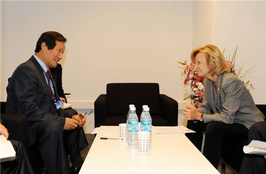 [아시아경제 장용석 기자] 제64차 '국제통화기금(IMF)/세계은행(WB) 연차총회' 참석차 터키 이스탄불을 방문 중인 윤증현 기획재정부 장관이 5일 오후(현지시간) 엘레나 살바도 멘데즈 스페인 재무장관과 만나 양자 면담을 하고 있다. 윤 장관은 이날 멘데즈 장관과의 면담에서 주요 20개국(G20) 정상회의 협력방안과 쿼타(지분) 등 IMF 개혁 방안을 협의했다.