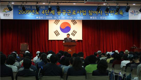 [아시아경제 박종일 기자] 금천구(구청장 한인수)는 6일 오전 10시부터 12시까지 구청 대강당에서 공공근로사업 참여자들에게 안전의식을 고취하기 위해 '공공근로사업 참여자 안전교육'을 했다.