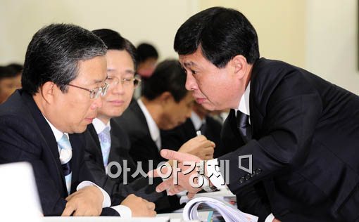 [아시아경제 윤동주 기자] 6일 서울 종로구 수송동 국세청에서 열린 국정감사에서 채경수(오른쪽) 서울지방국세창장이 송광조 조사국장과 자료 공개에 대한 의견을 나누고 있다.