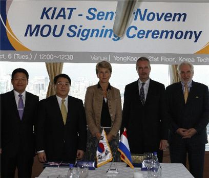 $pos="C";$title="KIAT";$txt="6일 열린 MOU체결식에서 김한주 KIAT 기술협력단장, 석영철 KIAT 부원장, 르네 베르캄프 네덜란드 경제부 기업혁신 차관, 윌리엄 잔스 즈왈브 네덜란드 혁신청 원장, 한스 하인스 브록 주한 네덜란드 대사(왼쪽부터) 등이 기념활영하고 있다. ";$size="408,348,0";$no="200910061414018748726A_1.jpg";@include $libDir . "/image_check.php";?> [아시아경제 이경호 기자]한국산업기술진흥원(KIAT, 원장 김용근)은 6일 역삼동 한국기술센터에서 네덜란드 혁신청인 센터노벰(SenterNovem)과 협력협정(MOU)을 체결했다.