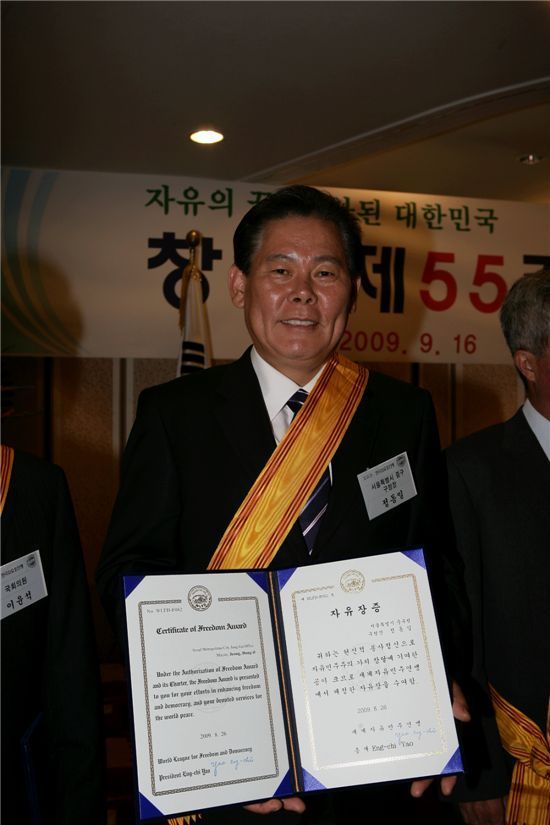또 정동일 서울 중구청장이 지난달 16일 남산자유센터에서 열린 한국자유총연맹 창립 55주년 기념식에서 세계자유민주연맹(WLFD, World League for Freedom and Democracy) 포상인 ‘자유장’을 수상했다.