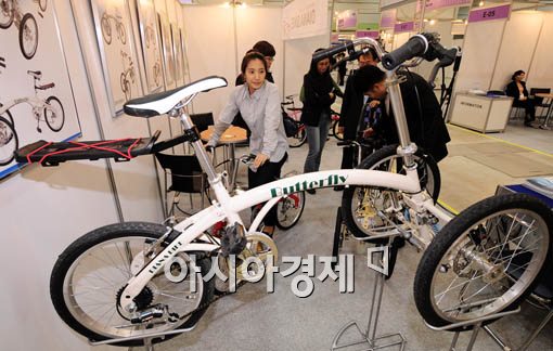 [아시아경제 윤동주 기자] 7일 서울 삼성동 코엑스에서 열린 '충청권벤처프라자'행사에서 한 충청권 벤처기업에서 전시중인 접이식 자전거를 관람객들이 둘려보고 있다.