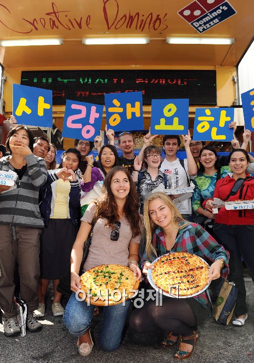 [아시아경제 이재문 기자] 도미노피자가 한글날을 이틀 앞두고 7일 서울 경희대학교 국제교육원 앞마당에서 한글을 배우는 세계 각국의 외국인 학생들을 격려하기 위한 도미노 피자파티를 열었다. 피자파티를 찾은 외국인 학생들이 '사랑해요, 한글!'을 외치고 있다.