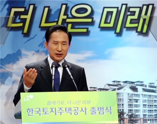 이 대통령은 아울러 "새로 통합된 토지주택공사는 민간회사와 경쟁할 필요 없이 오로지 스스로 경쟁해야 한다"면서 보다 공익적인 분야에서 노력해달라고 당부했다.