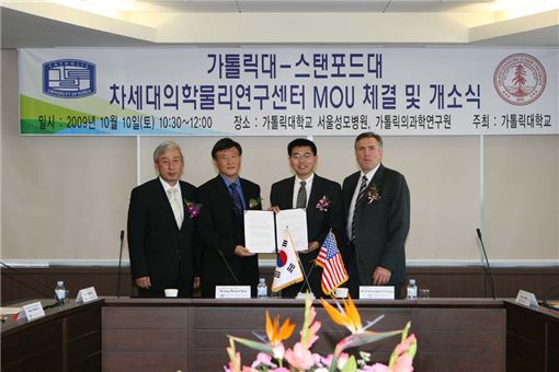 가톨릭대학교 생체의공학연구소와 스탠포드대학교 분자영상연구센터(MIPS) 및 방사선종양학과 의학물리연구소는 10일 서울성모병원에서 양해각서(MOU)를 체결식을 갖고, 첨단 암치료 기술을 선도할 '차세대 의학물리연구센터(센터장 서태석 교수)'를 가톨릭의과학연구원 1층에 오픈하기로 했다.