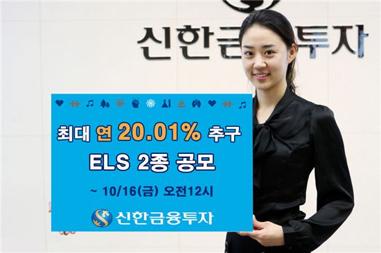 [아시아경제 박선미 기자]신한금융투자(www.goodi.com, 사장 이휴원)는 오는 13일부터 16일까지 4일간, 최고 연 18.00% ~ 20.01% 수익을 추구하는 2년 만기 원금비보장형 ELS 2종을 공모한다.