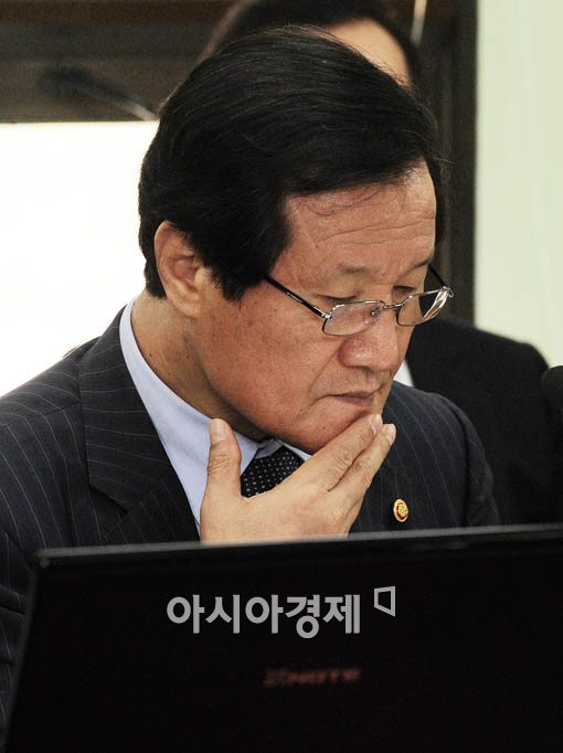 [아시아경제 윤동주 기자] 12일 오전 과천정부청사에서 열린 기획재정부 국정감사에서 '4대강 사업 관련해 질의가 계속되자' 윤증현 장관이 머리가 신중한 표정으로 자료를 검토하고 있다.