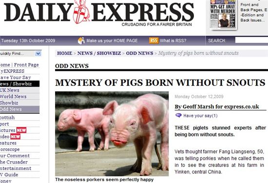 영국 일간 데일리 익스프레스는 코 없는 돼지들이 중국에서 발견돼 전문가들조차 놀라움을 금치 못하고 있다고 12일(현지시간) 보도했다.