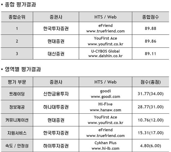 영역별 평가도 진행됐다. 트레이딩 부문에서는 신한금융투자, 정보제공부문에서는 하나대투증권이 우수 증권사로 선정됐다. 커뮤니케이션 부문에는 현대증권, 지원서비스와 속도·안정성 부문에서는 각각 한국투자증권과 하이투자증권이 좋은 점수를 받았다.