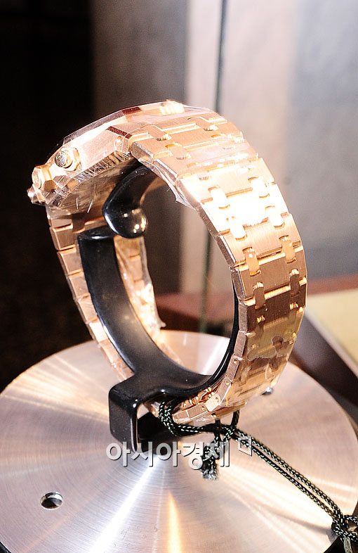 [아시아경제 윤동주 기자] 13일 서울 광장동 워커힐호텔에서 명품 시계전이 열렸다. 세계 3대 명품 시계 브랜드 중 하나인 시계전체를 금으로 장식한 '오데마르피게'의 로얄오군로 시계가 전시되고 있다.
