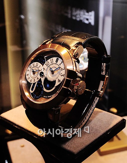[아시아경제 윤동주 기자] 13일 서울 광장동 워커힐호텔에서 명품 시계전이 열렸다. 세계 명품 시계 브랜드 중 하나인 '해리 윈스턴'의 오시언타임존 듀얼타임 시계가 전시되고 있다.