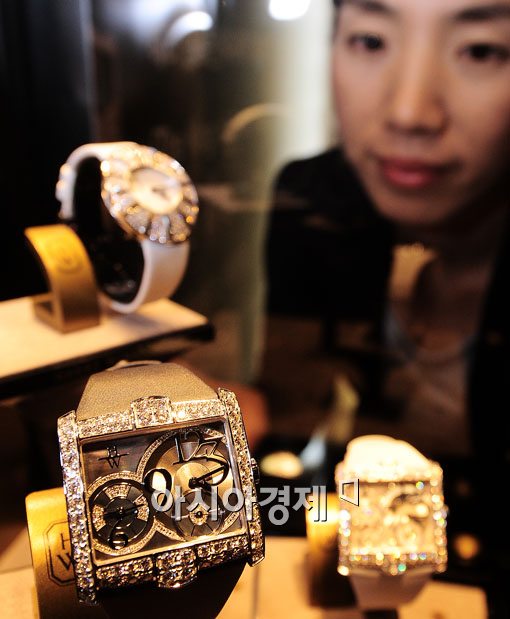 [아시아경제 윤동주 기자] 13일 서울 광장동 워커힐호텔에서 명품 시계전이 열렸다. 세계 명품 시계 브랜드 중 하나인 '해리 윈스턴'의 에비뉴스퀘어 시계가 전시되고 있다.
