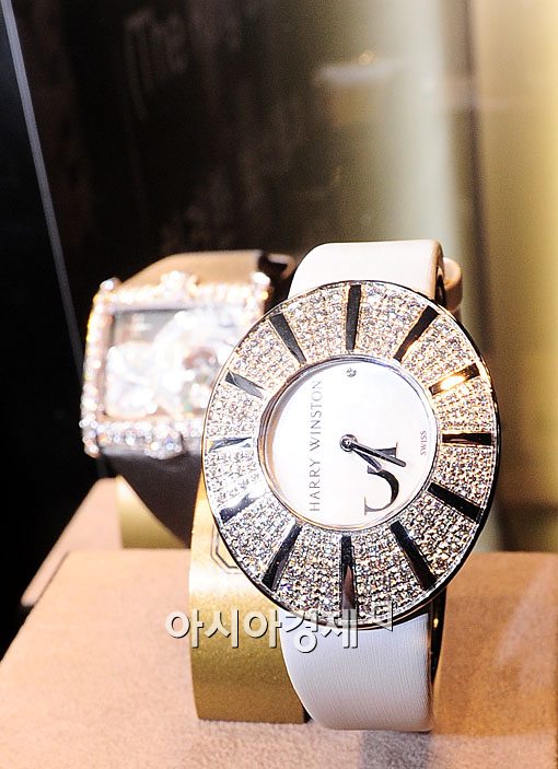 [아시아경제 윤동주 기자] 13일 서울 광장동 워커힐호텔에서 명품 시계전이 열렸다. 세계 명품 시계 브랜드 중 하나인 '해리 윈스턴'의 에비뉴스퀘어 다이아장식 톡투미 시계가 전시되고 있다.