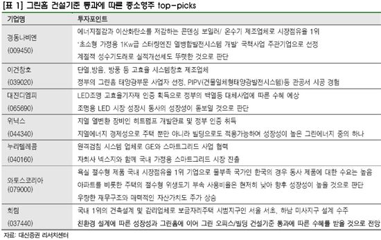 그는 이어 "이번에 발표된 그린홈 건설기준의 핵심이 효율적인 에너지 사용으로 인한 이산화탄소 절감에 있다"며 "이에따라 에너지를 줄일 수 있는 보일러업체와 창호ㆍ단열재 등의 건자재업체, 효율적인 전력을 사용할 수 있는 스마트그리드, 태양열ㆍ지열 등의 그린에너지, 주택내의 전등ㆍ전력을 효율적으로 제어 할 수 있는 홈네트워크 업체들이 수혜를 받을 것"이라고 분석했다.