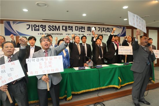 [아시아경제 박충훈 기자] 14일 전국소상공인단체연합회의 회원들이 여의도 중소기업중앙회에서 기자회견을 가진 후 'SSM(기업형 슈퍼마켓)에 대책 마련을 촉구하는 구호를 외치고 있다. 이날 회원들은 'SSM 허가제'를 바탕으로 하는 정책이 다음달 11일까지 정부로부터 나오지 않을시 강경한 단체행동에 들어가겠다고 밝혔다.