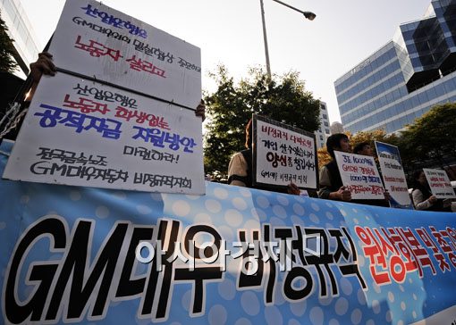 [아시아경제 윤동주 기자] 14일 오후 프리츠 핸더슨 GM회장이 GM대우 자금 지원 문제등을 논의하기 위해 산업은행을 방문하기로 예정된 가운데 GM대우 도급업체 해고 직원들이 고용보장을 요구하며 기습 시위를 갖고 있다.