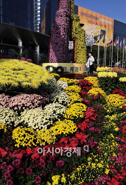 페스티벌 중앙 무대에 설치된 'G20정상회의' 한국유치를 기념하는 화려한 꽃들이 출근길 시민들의 발걸음을 사로잡고 있다.