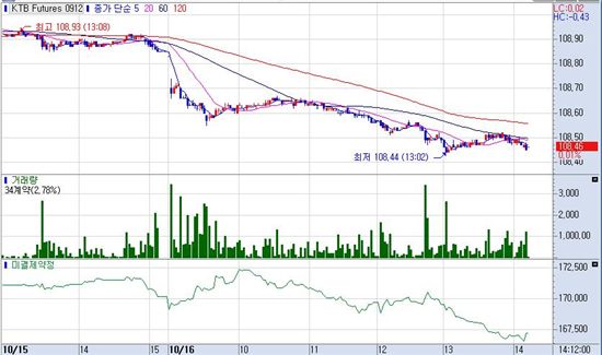 같은시간 12월만기 3년물 국채선물은 전일대비 37틱 폭락한 108.46으로 거래중이다. 이날 국채선물은 13틱 떨어진 108.70으로 개장해 별다른 반등없이 꾸준히 하락하는 모습을 보이고 있다.